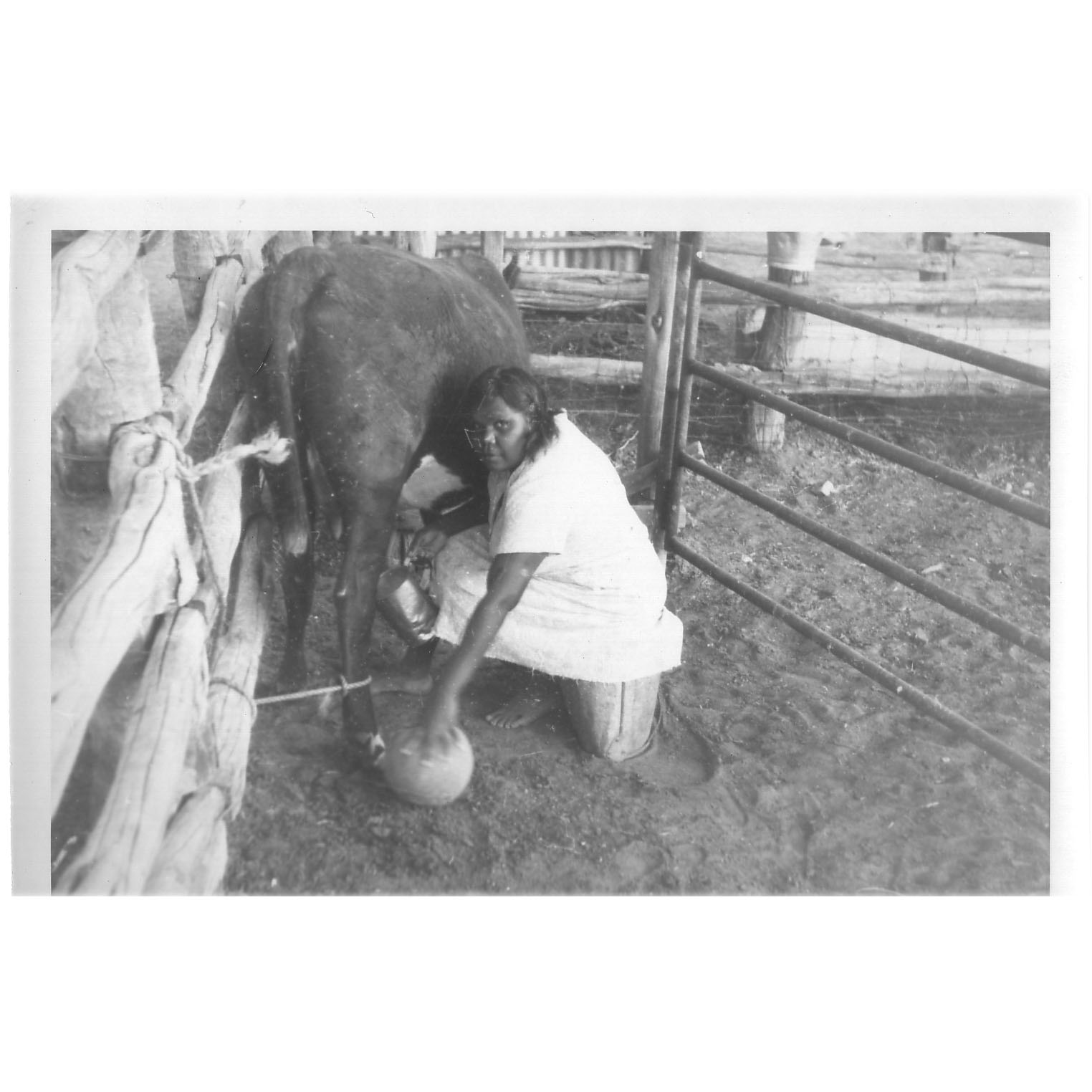 We was working, ironing, washing the laundry, and water boil, too hard. We making bread punching, punching, milking cows, making butter. Milk run self and cream, butter. Soap bucket for laundry. All the ladies work then. Take toilet water out then, bucket, heavy one. Kids come from school, wash clothes, clean ones, iron, ready for next day. Kids line up everyday, morning, cup of tea maybe porridge, and dinner time now, come in big mob. Get all rations, take-im to camp then, we go make tucker then.